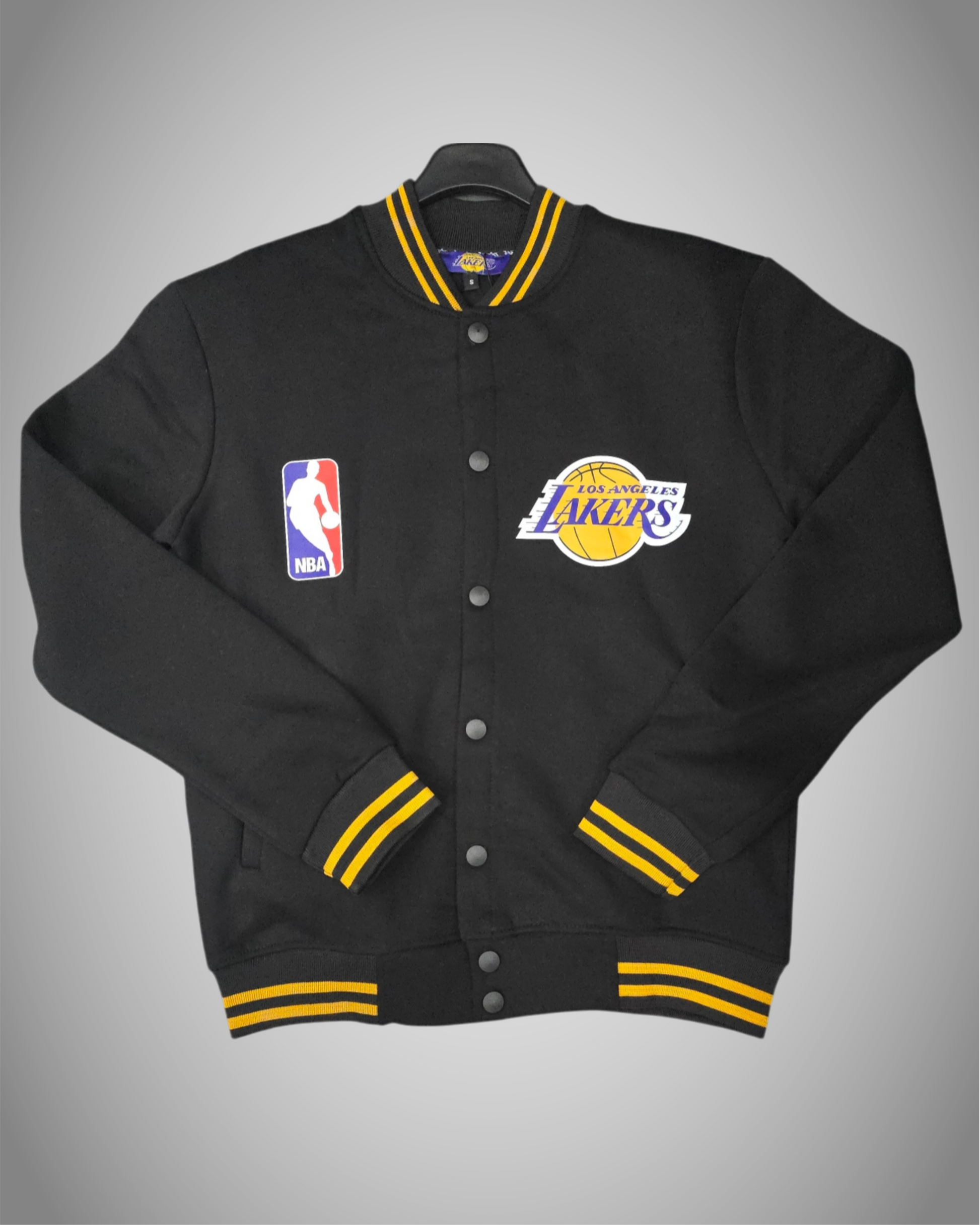 Lakers varsity jacket featuring classic team colors, bold logo detailing, and a retro athletic cut. A statement piece that blends street style with true fan spirit.