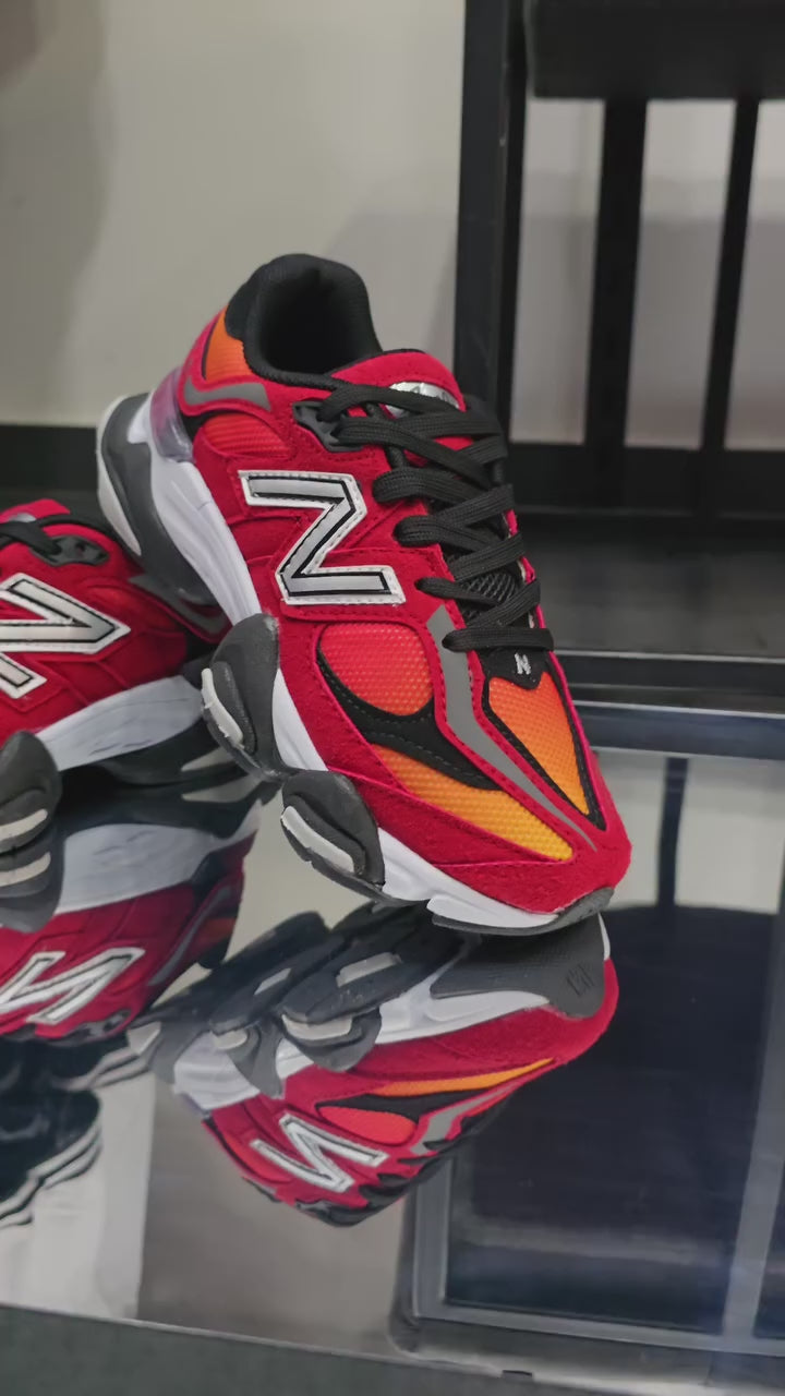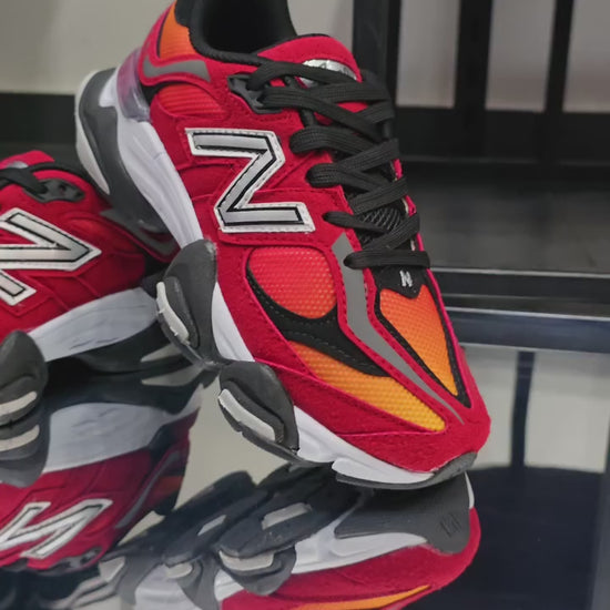 The DTLR x New Balance 9060 “Fire Sign” is a bold collaborative sneaker that brings fiery energy to the classic New Balance 9060 silhouette. Inspired by volcanic eruptions, it features a gradient mesh upper in blazing red, orange, and yellow tones with contrasting suede overlays and reflective silver branding. The chunky dual-density midsole with ABZORB cushioning delivers comfort and stability, while black accents ground the explosive colorway making it a standout lifestyle runner with a heat-inspired look.